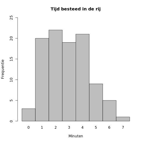 In dit geval ligt de piek van de grafiek bij #2# minuten, met een geobserveerde frequentie van #31#.
