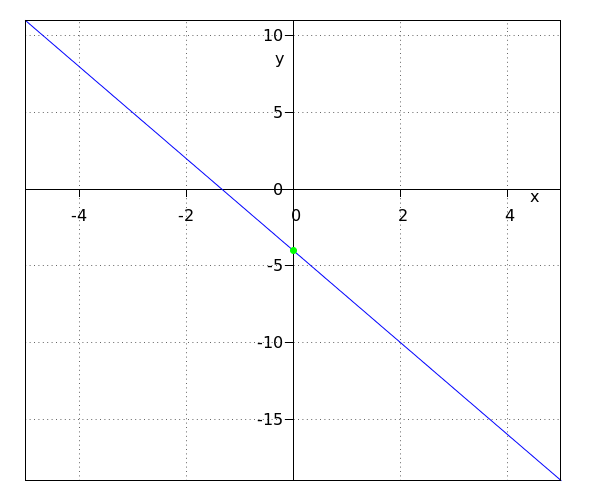 Del mismo modo, al ingresar #x=0# y #y=q# en la ecuación, #-3 x + 7 y = -21# da la ecuación lineal #7\cdot q = -21# que resulta en #q=-3#.